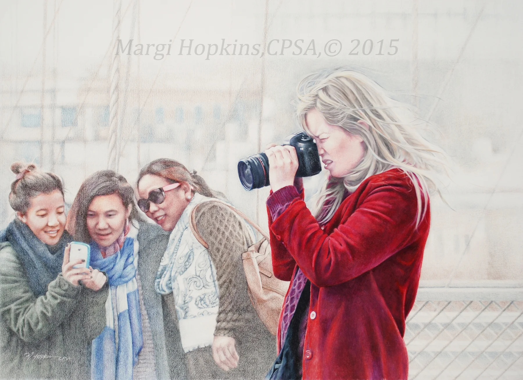 First Contrasting textures and color are used to manipulate the viewer's focus. The saturated red coat and black Nikon, achieved by combining solvents with heavy handed applications of cp, are intended to grab attention. From there, a lighter touch of pencil on the textured surface provides a grainy mid ground, which along with careful detailing, gently pulls the eye away from the woman in the red coat, to the three girls and finally to the ghostly treatment of the bridge with its suggested urban setting. Second I explore the contrasting focus of the subjects. The serious photographer vs the silly high school girls with their teal phone, plus my point of view on the sideline, show three completely different perspectives.