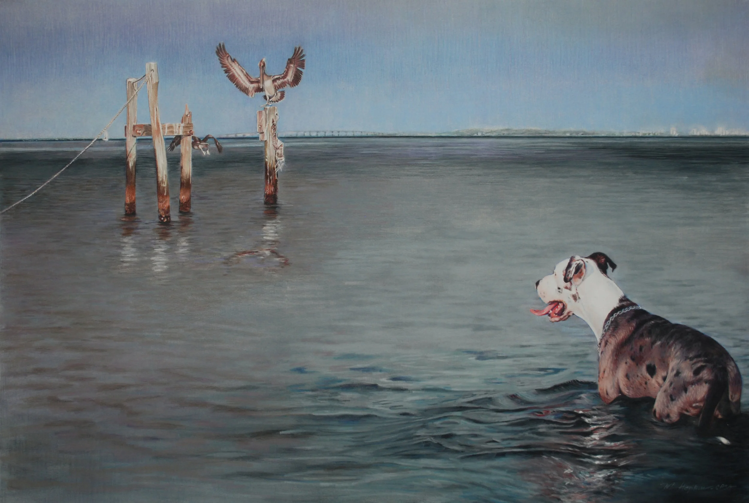 The sweet, sometimes ornery, sometimes destructive, sometimes messy Great Dane has passed away. He was a wonderful, big ol' doofus who will be missed. This painting, Bay Watch, depicts Jax in Pensacola Bay, late afternoon. The sand bar goes out a long way, so one can wade 1/4 of a mile or so before submerging. Jax was my nephew's dog. We spent a lot of time on this small stretch of beach, Jax barking at pelicans and chasing driftwood sticks into the water.